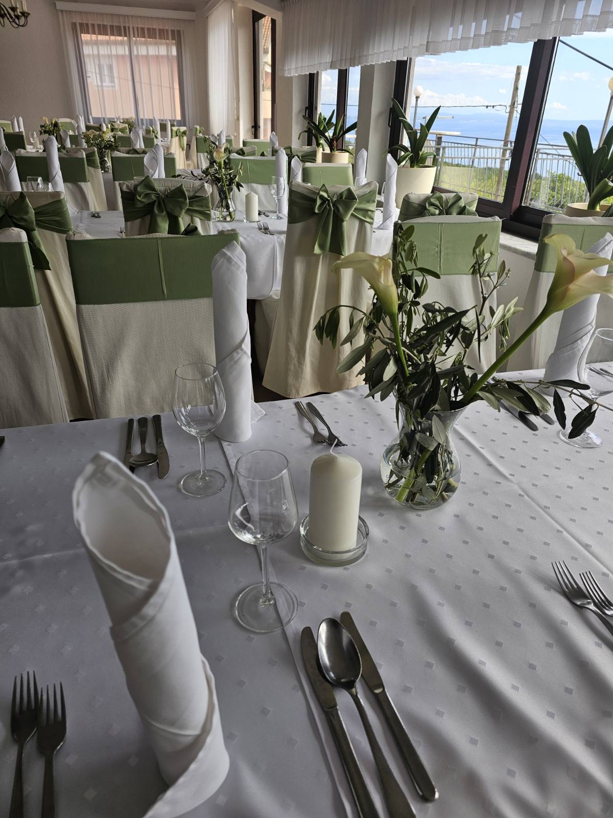 Na raspolaganju vam je prostrana i sunčana sala, kapaciteta do 150 uzvanika, s koje se pruža prekrasan panoramski pogled na Kvarnerski zaljev. Prostor je prilagođen organizaciji svadbenih svečanosti, s mogućnošću rasporeda okruglih i četvrtastih stolova te dovoljno mjesta za glazbu i ples.